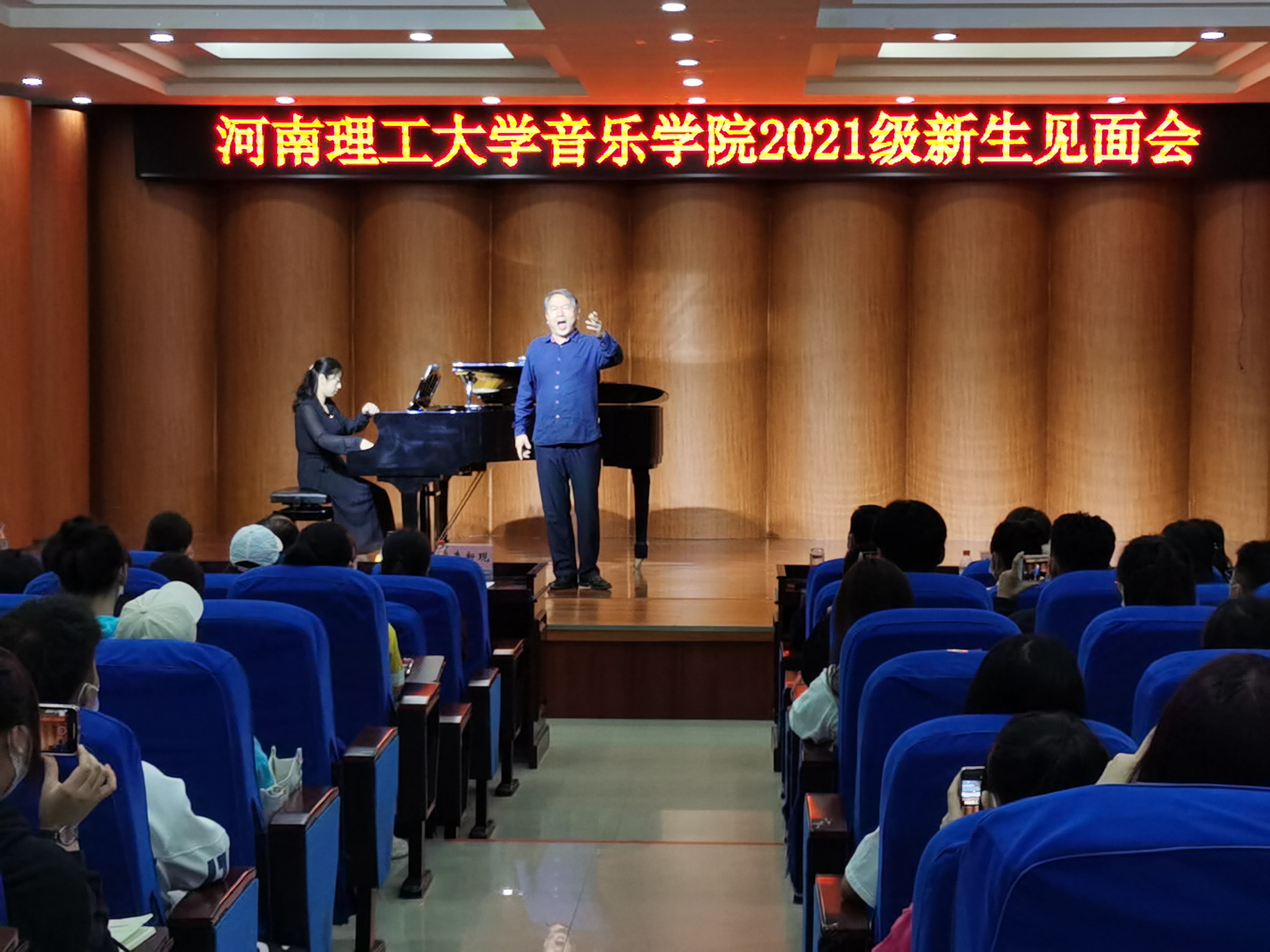 会上,院长李新现代表学院对2021级新同学表示了热烈祝贺和诚挚欢迎,详细介绍了学院办学历程、学科建设、师资力量、教学场地等学生们关心关注的事项。与此同时,李新现为2021级新同学上了一台生动的思想政治课。他结合当前党史学习教育、新冠疫情防控,从梦想、善良、担当等几个方面对同学们提出殷切希望:一是要牢记初心与梦想,在百年理工、青春音院的舞台上尽情绽放华彩乐章。二是要牢记诚信与善良,在音乐艺术的殿堂里学好本领、学做真人。三是要牢记责任与担当,坚定理想信念,听党话、跟党走,为实现中华民族伟大复兴中国梦贡献青春。随后,李新现现场即兴演唱歌曲《妈妈》《两地曲》将会场气氛推向高潮,赢得现场同学热烈掌声和强烈共勉。