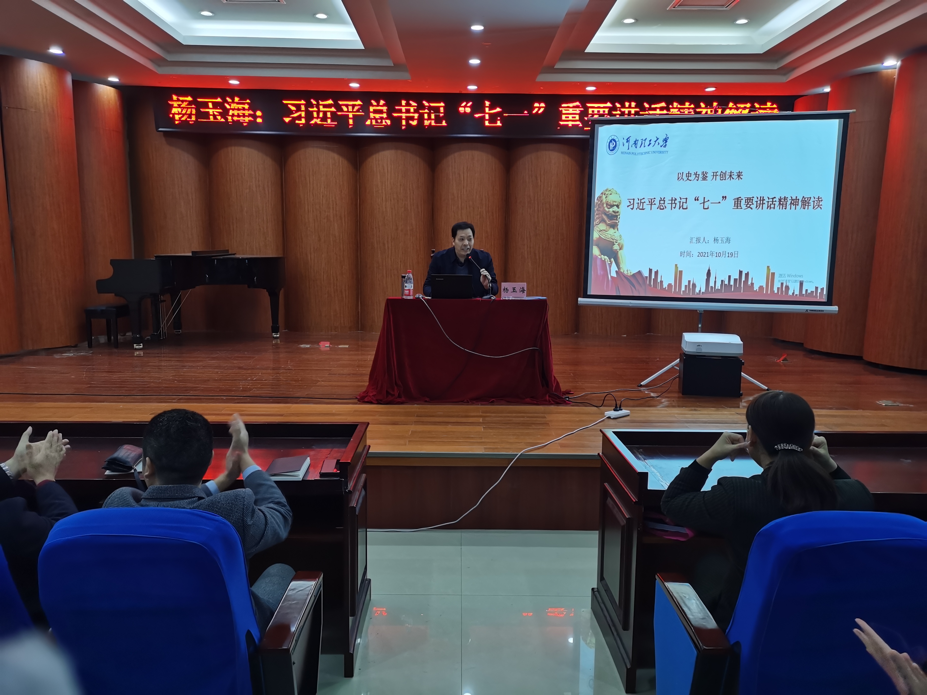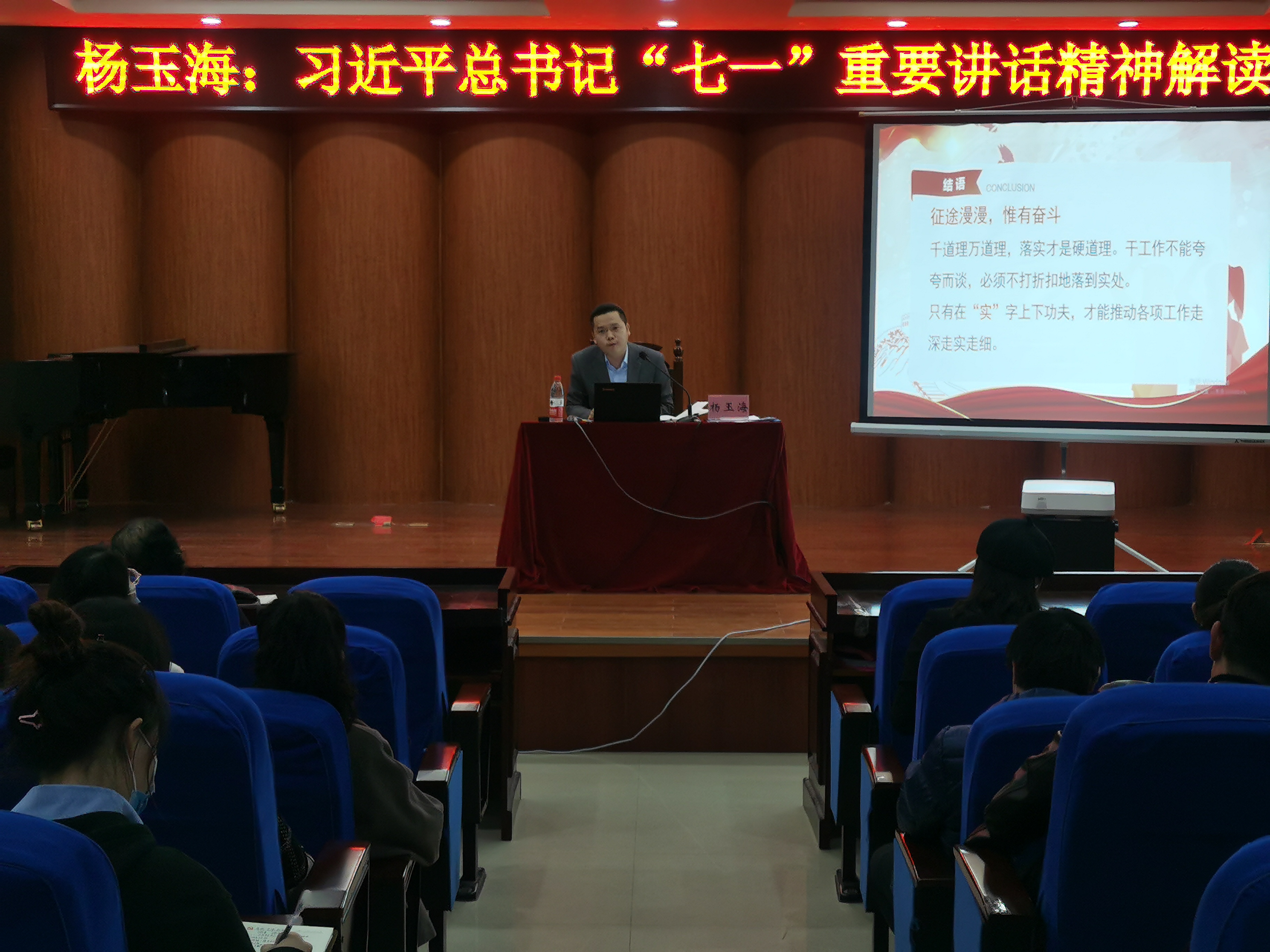 为深入学习宣传习近平总书记在庆祝中国共产党成立100周年大会上的重要讲话精神,推动党史学习教育走深走实,10月19日下午,学院党总支书记杨玉海以《习近平总书记“七一”重要讲话精神解读》为题,作专题党课报告。报告会在文科楼一楼音乐厅举行,学院全体教师及全体学生党员一百余人参会。报告会由学院党总支副书记王建军主持。