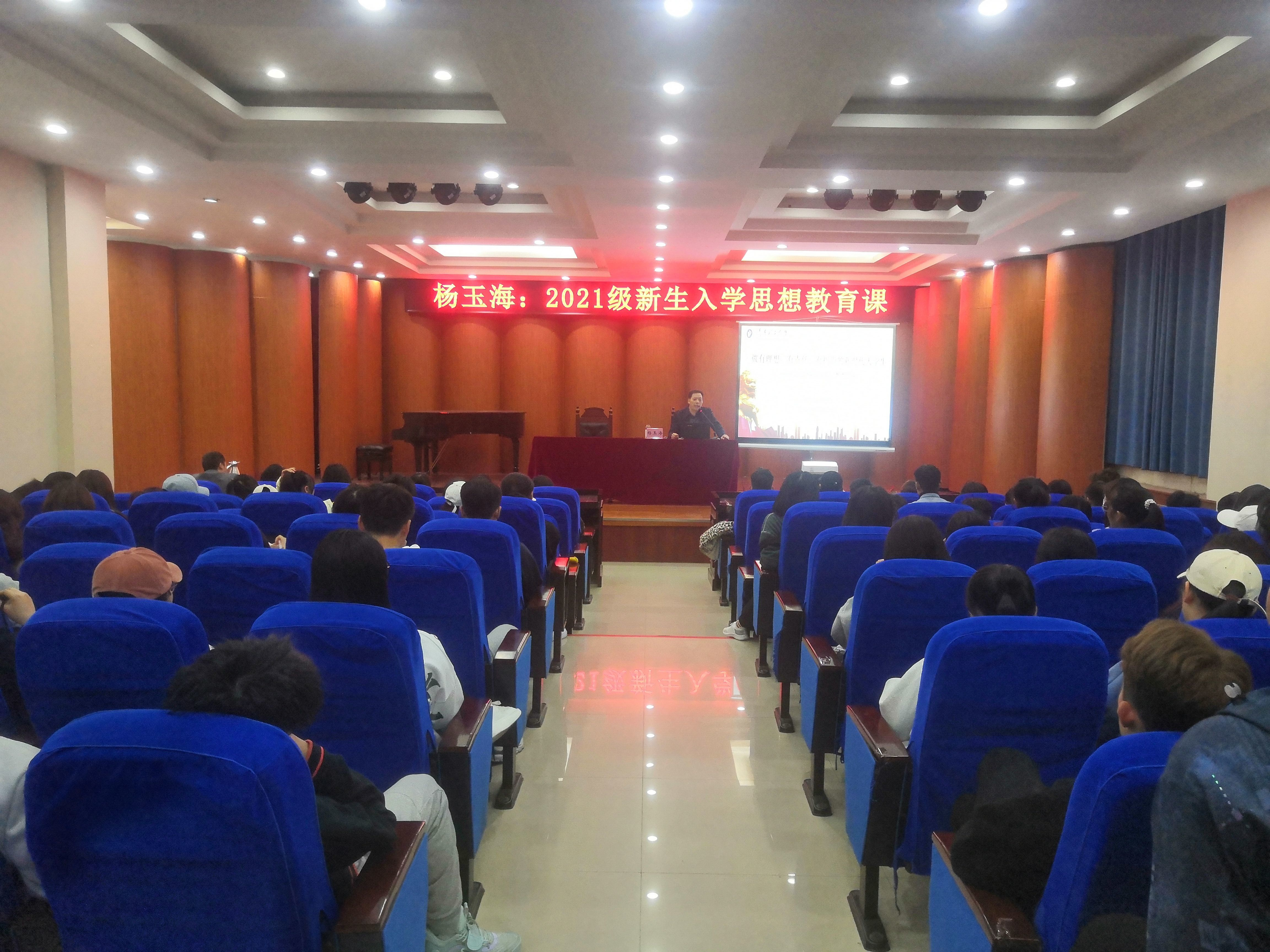 10月30日晚,学院党总支书记杨玉海在文综楼一楼音乐厅,以《做有理想、有责任、有担当的新时代大学生》为题,为2021级学生上了一堂专题思想政治教育课。学院党政办、学工办、院团委等负责老师,新生辅导员以及2021级全体本科生、研究生120余人聆听讲课。