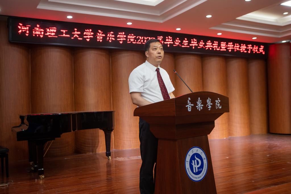 党委书记杨玉海在典礼上致辞。首先,他深情地回顾了同学们在校期间的点点滴滴,随后对毕业生提出了殷切的希望。一是要讲品味,要老老实实、本本分分做人,坚持追求真善美,把德艺双馨作为自己的最大追求。二是要讲格调,要葆有正确的艺术风格和理想情怀,把做人、做事和从艺统一起来,唱响主旋律,传播正能量。三是要讲责任,将“选择音乐,就选择了责任”凝结成为音乐人血液中的一种精神,矢志不渝坚持奋斗,为文化强国贡献青春力量。