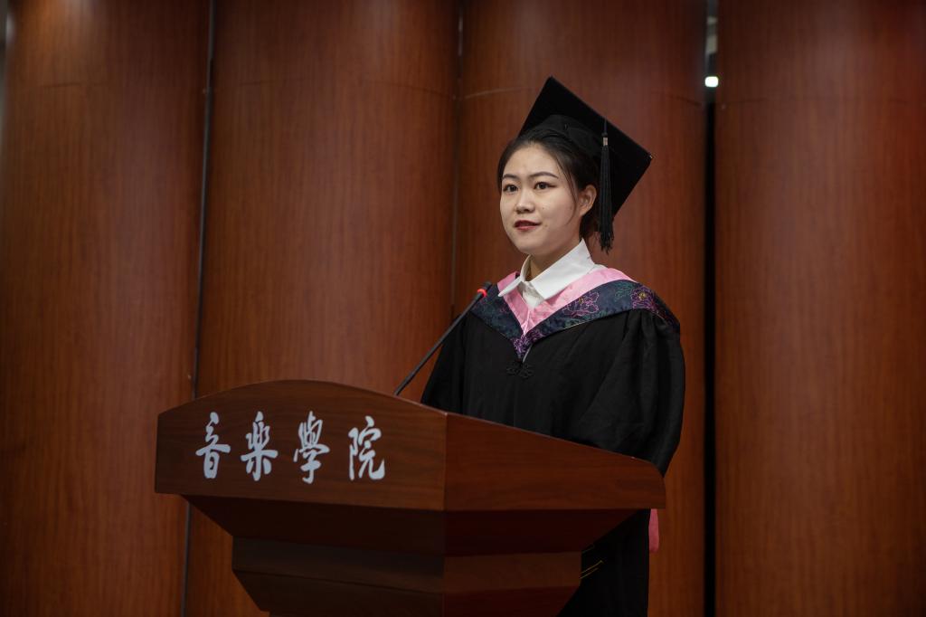 本科毕业生代表音表1801班陈晨同学、硕士毕业生代表19级沈佳丽同学发言分别代表毕业生表达了对母校和学院的感恩以及惜别之情。教师代表舞蹈系主任王庆花教授发表了寄语,表达了对同学们的美好祝愿,希望大家要设定明确现实的目标,制定科学合理的规划,并为之坚持不懈的奋斗。